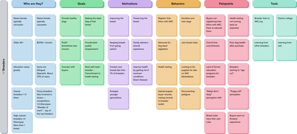 We also established the three primary personas that interface with the American Kennel Club and uncovered their assumed goals, motivations, pain points, and user journeys. During our research, we would establish what else happens in these journeys and if AKC’s perceptions of them rang true.