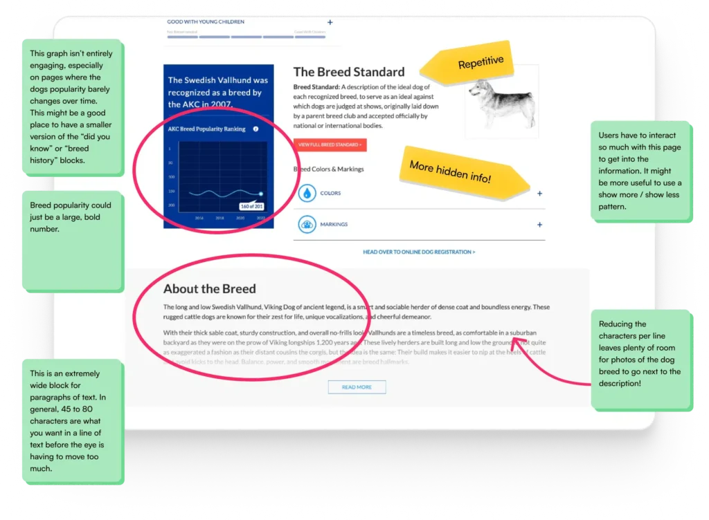 We learned from our usability tests and interviews that potential new dog owners are seeking validation for a dog breed choice they’ve made from an in-person experience. After validating that this breed is right for them, they seek out a reputable breeder. Their expectations were met in the former but left wanting for the latter.
