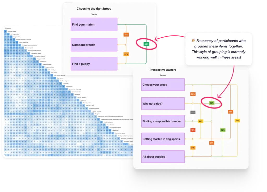 In our card sorting tests, we also uncovered more natural ways users are categorizing items found on AKC.org’s navigation. As such, we suggested incremental changes to the navigation in the short-term, such as reorganizing existing sections, using more descriptive taxonomy, and designing more landing pages, to align more with the patterns we identified from this data. But ultimately, the data confirmed the assumption we had from our discovery workshops – an overhaul to the structure and design of the navigation was eventually necessary.