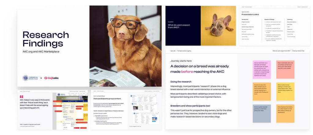 The American Kennel Club (AKC), one of the world’s original kennel clubs recognizing over 200 dog breeds, approached us with a broad set of goals and expectations for how they imagined their digital products might evolve alongside their growing brand and ecosystem. Key among these goals was uncovering the “why” in the early journey of dog owners, dog sport participants, and dog breeders. What do they expect from the AKC?