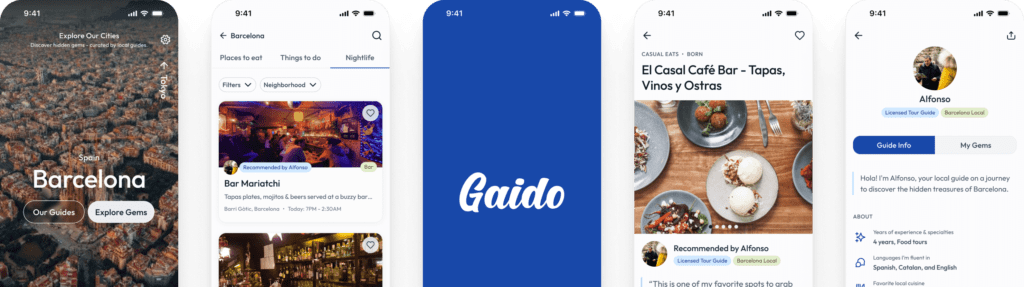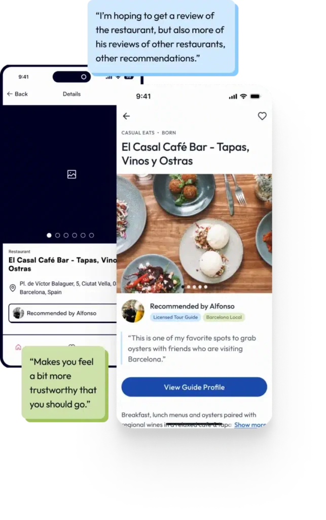 During moderated usability tests of our lo-fi designs, participants expressed a keen interest in learning more about the guides and their role on the platform. They wanted insights into the guides’ backgrounds and motivations for providing recommendations, as well as opportunities for interaction. In response, we made the guides’ role more visible in the app’s interface in our hi-fi designs, allowing them to write thorough descriptions explaining why they were recommending specific spots. This personal touch not only distinguished Gaido from other travel products but also added credibility to the recommendations.