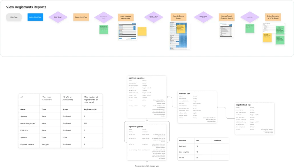Once we understood overall task flows for each module independently, we outlined platform logic in further detail using data structure diagrams. Diving further into the interconnectivity between databases ensured that we could create the proper backend connections across related data for attendees, hotels, fees, forms, reports, project management, and event scheduling. Mapping out these dependencies also helped inform our approach to streamlining workflows dealing with multiple linked databases.