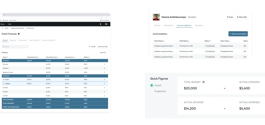 This module showcases the complexity of the interconnected databases we managed. For example, under Revenue, users might track incoming fees from attendee registrations and advertisement purchases by sponsors, while the Expenses section might display payments made to hotels for attendee accommodations. Each transaction must be meticulously recorded in the appropriate database; in other words, linking registrant fees to individual attendees, sponsor purchases to specific companies, and accommodation fees to both the relevant hotels and their assigned attendees. Ensuring all information is accurately mapped was crucial for maintaining database consistency and reflecting the correct relationships throughout the platform.