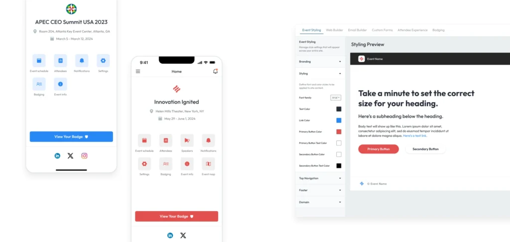 To achieve this, we designed flexible skeleton layouts for all attendee-facing UI, mapping brand elements to specific components like buttons, links, and logos. By centralizing the event styling process, administrators could define and apply branding elements in a single location within the event management suite. Once set, these fonts, colors, and logos were automatically propagated across all user-facing parts of the platform. This approach not only ensured a cohesive brand experience for attendees, but also streamlined the event setup and creation process for administrators.
