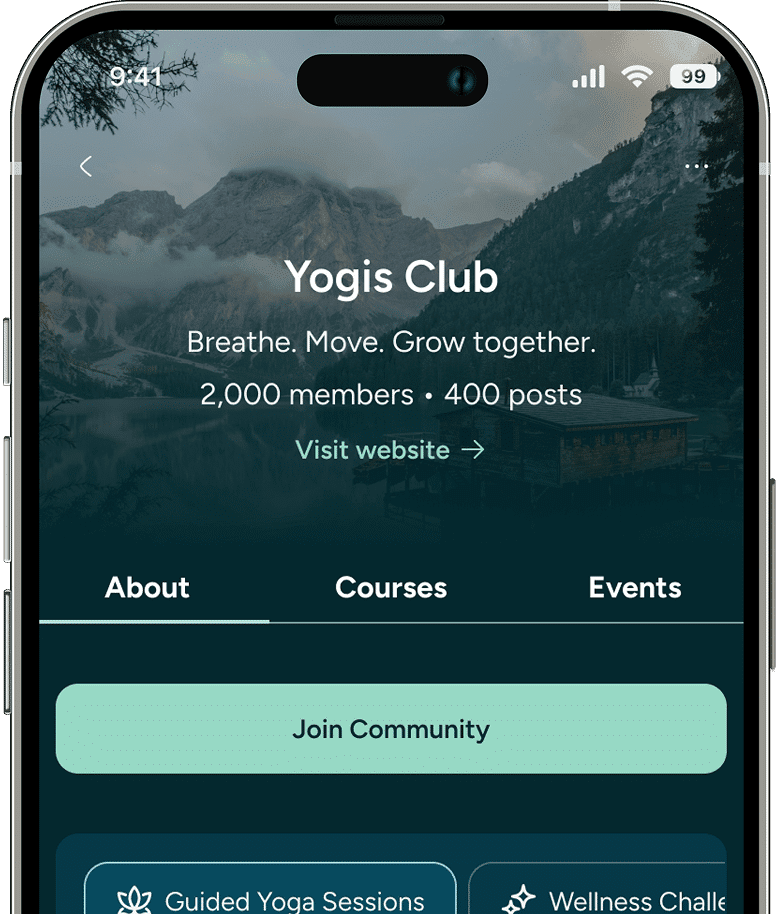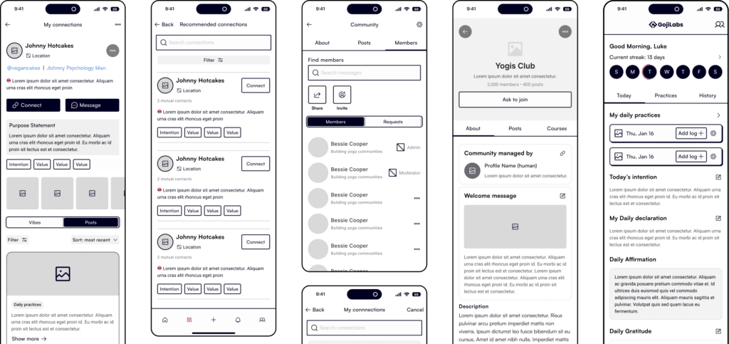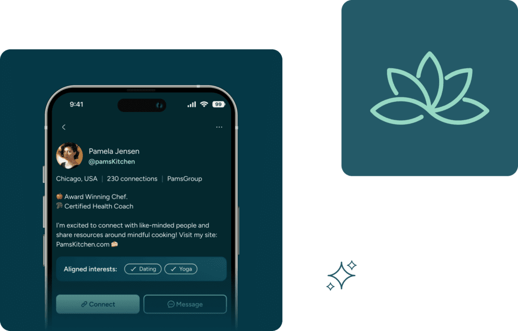 From the start, users define their intentions, goals, and interests, allowing the platform to tailor content recommendations across communities, events, courses, and practices.