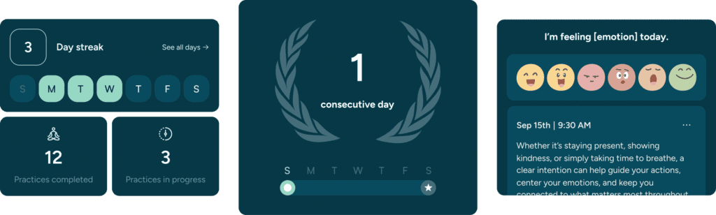 4. Personalized Practice Recommendations adapt to each user’s goals, moods, and habits—using onboarding inputs and ongoing behavior to suggest timely, relevant practices that support consistency and personal growth.