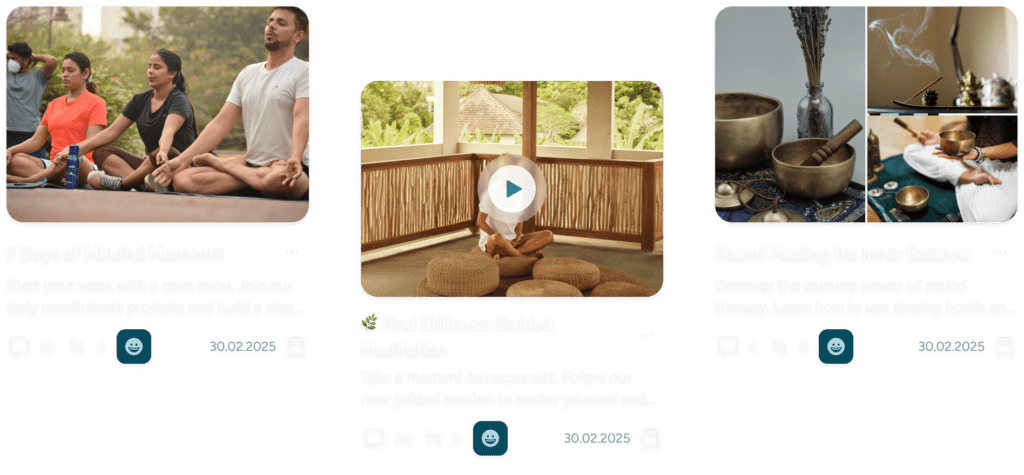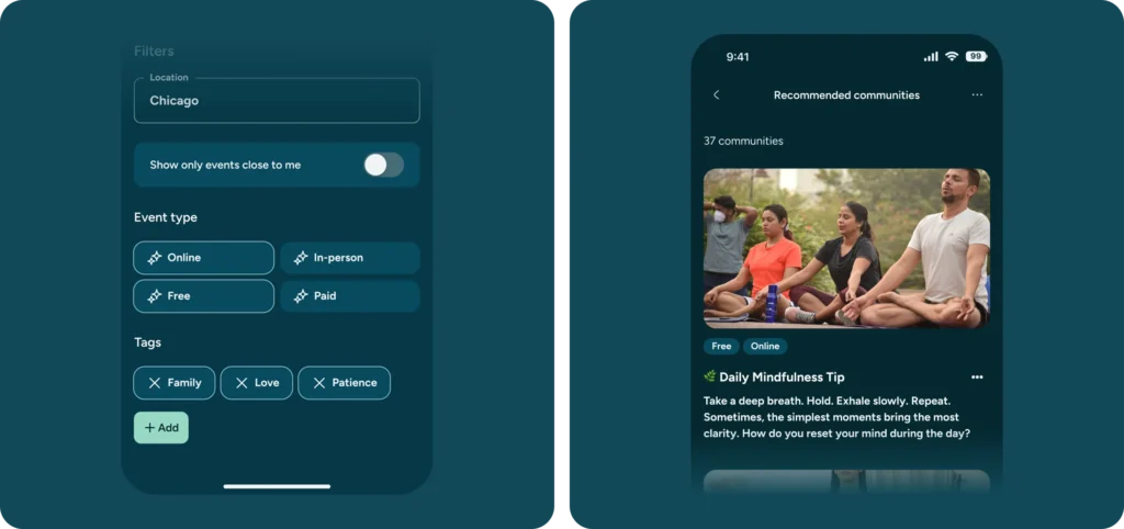 In our design, we made it easy for users to discover content that fits their goals and current mood. We combined helpful filters with personalized suggestions, so users can quickly find the right practices, communities, or events without feeling overwhelmed.