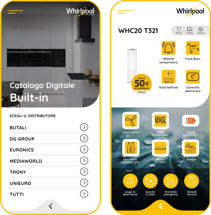 For Whirlpool, we developed a web app and a mobile app to help distributors and sales staff access and manage product catalogs for Whirlpool, Indesit, KitchenAid, and Hotpoint. The app enabled users to explore freestanding and built-in products, compare options, and quickly generate customized PDF catalogs. With role-based user management and an admin-friendly backend, the app not only streamlined distributor operations but also enhanced streamlined distributor operations and enhanced the overall sales experience.